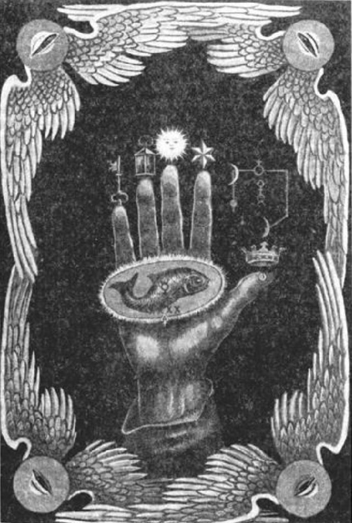 РУКА МИСТЕРИЙ На рисунке изображена рука философа, протягиваемая тем, кто посвящается в мистерию. Когда ученик великого искусства впервые касается этой руки, она сжимается, и он должен догадаться, как вновь сделать ее открытой, как если бы скрытая перед ним мистерия оказалась для него доступной. В алхимии рука означает формулу приготовления настойки физикорум. Рыба — это ртуть, а горящие берега моря, в котором обитает рыба, — это сера; на каждом пальце помещена эмблема Божественного Вершителя, который осуществляет операции в момент Большой Работы. Неизвестный художник дал такую оценку всего изображения: «Мудрец приносит клятву этой рукой, что не будет учить искусству без иносказания».
