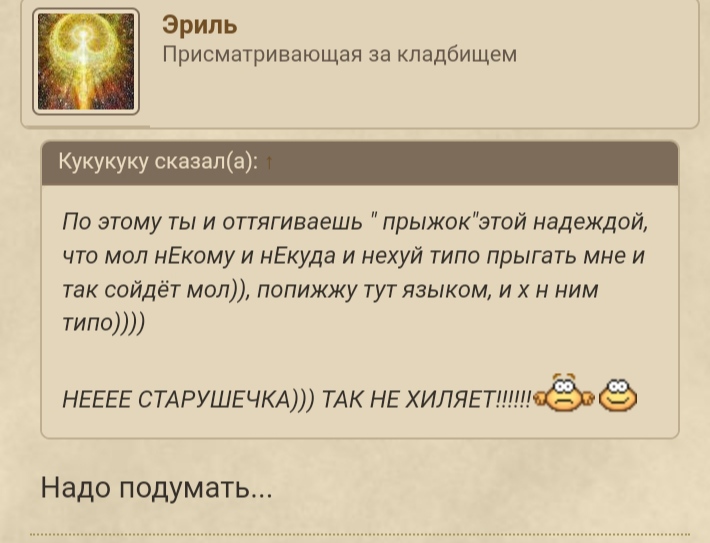 Да это всё ясно... Ты ( я он она) может оправдаться что мол время не пришло, и сознание через мой персонаж ещё набухает, и сценарий именно таков,, и не обязательно в пещере или дома на диване , а главное понять что нетдвух и т д А "дело "где?? ну да,, типо,, ещё время не пришло на крест( своих страхов/ васан) ложиться.. и типо я буду ждать смерти тела ( от старости к примеру) и тогда, может быть, сцеанриум меня подведёт к этой черте" действия",, и я мол может быть " прыгну" / " соскачу действием со своих придумок/ васан... ты так думаешь))) Вот я к чему..., пока тебячу всё устраивает, лёжа на диване ты строчишь на компе эти строчки направо и налево,,,)) тебе и так не дует,, так зачем куда то сдрискивать телом с сумой в лаптях( ТИПО),, или зачем оставлять самое дорогое васаническое, и в мучения в окопы типо???? Я вот какой вектор раздумы предлагаю!!!! ну ты сейчас опять ту же дуду начнёшь, у попа была собаковая дуда))).что мол понимание идёт и всё отыграно а я лежу на диване и пижжу дальше ждя когда бульдозер судьбинывытолкнет мой придуманный куль с эговном из этой придуми называемлй нами миром. Ты на автомате штампуешь свои тексты про равану шмавану, таро шмаро.., ты подУМай хорошенько о чём я пытаюсь сказать!!!!!!!!! мож тогда и получится норм разговор,, я никого не учу, Я разговариваю Сам с Собой, посредством Тебя!!!