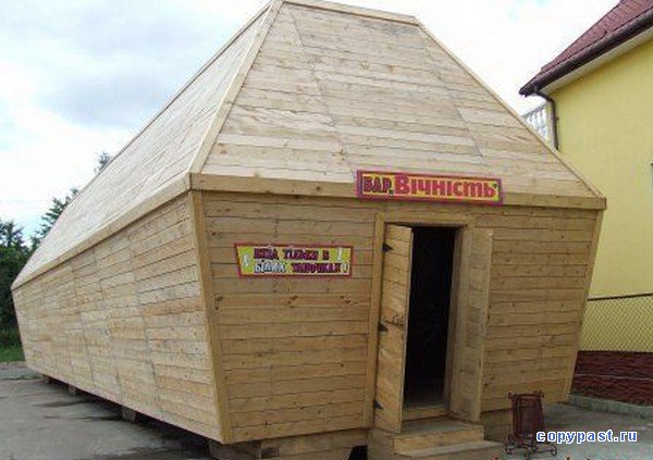 Бар в виде гроба В 2008 году в небольшом городке Трускавец (Украина) открылся бар в виде гроба. Это шокировало жителей, но заведение не имеет отбоя от посетителей. Владельцу бара «Вечность» принадлежит еще и фирма ритуальных услуг. Этот факт и определил дизайн питейного заведения. Всего же на создание гигантского гроба ушло 30 кубометров дерева, его длина — 20 метров, ширина — 6. Внутренний антураж не уступает внешнему: столики изготовлены в виде миниатюрных гробиков, официанты носят траур. Притом юмора создателям не занимать — при входе висит табличка: «Вход только в белых тапочках». Фишка заведения — специальное поминальное меню: «прощальные» бутерброды, блюдо под названием «Встретимся в раю» и фирменные салаты «40 дней» и «9 дней». Следует отметить, что готовят вкусно, поэтому не стоит переживать о том, что пророческие названия блюд сбудутся. Спойлер (Наведите указатель мыши на Спойлер, чтобы раскрыть содержимое) Раскрыть Спойлер Свернуть Спойлер